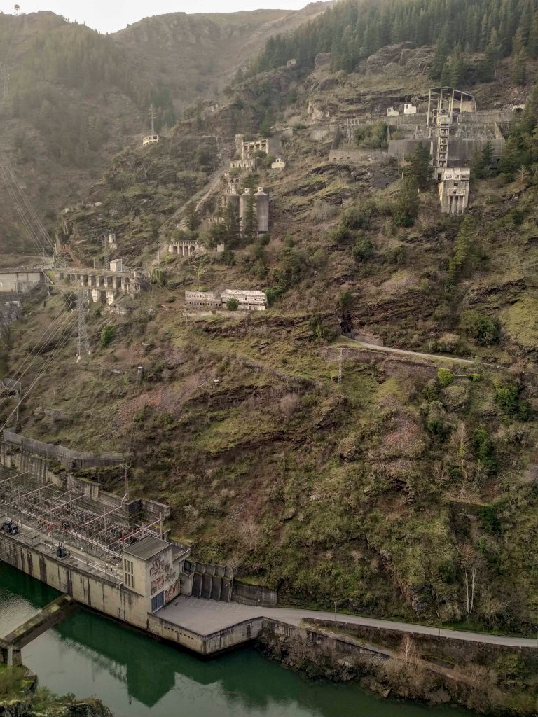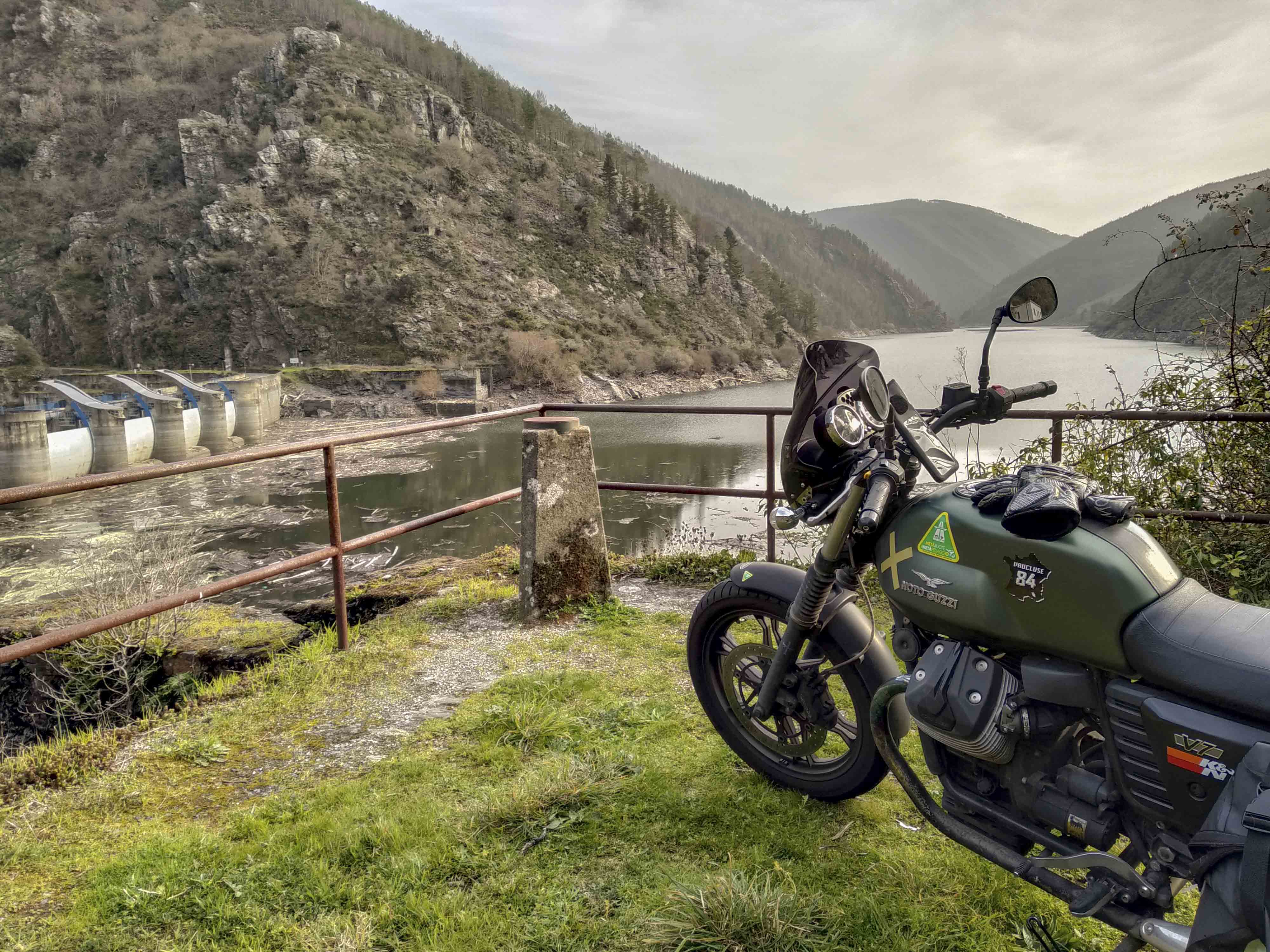 Y seguí el camino al puerto, pero el paisaje que me encontré me sorprendió mucho, me refiero al pueblo de Grandas de Salime. Empiezas a bajar y ya ves a tu izquierda unas montañas impresionantes y agua, que yo no sabía si era un río, un embalse un lago…no tenía ni idea. Total que por la carretera que es toda de curvas tienes unos apartados para asomarte y mirar hacia abajo… pare en todos los que iba viendo porque me pareció un lugar espectacular, le hice un montón de fotos a la moto con esas vistas. Pero bueno….sigues bajando y ya lo ves….una presa impresionante con unas casas abandonadas en la pared de la montaña.